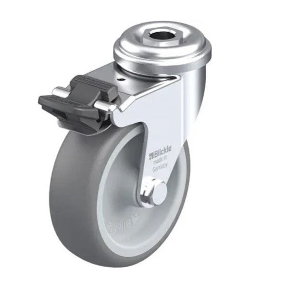 Apparatlänkhjul med fästhål, med bromssystem ”stop-fix”, hjul med termoplastisk gummibana, med polypropylenfälg